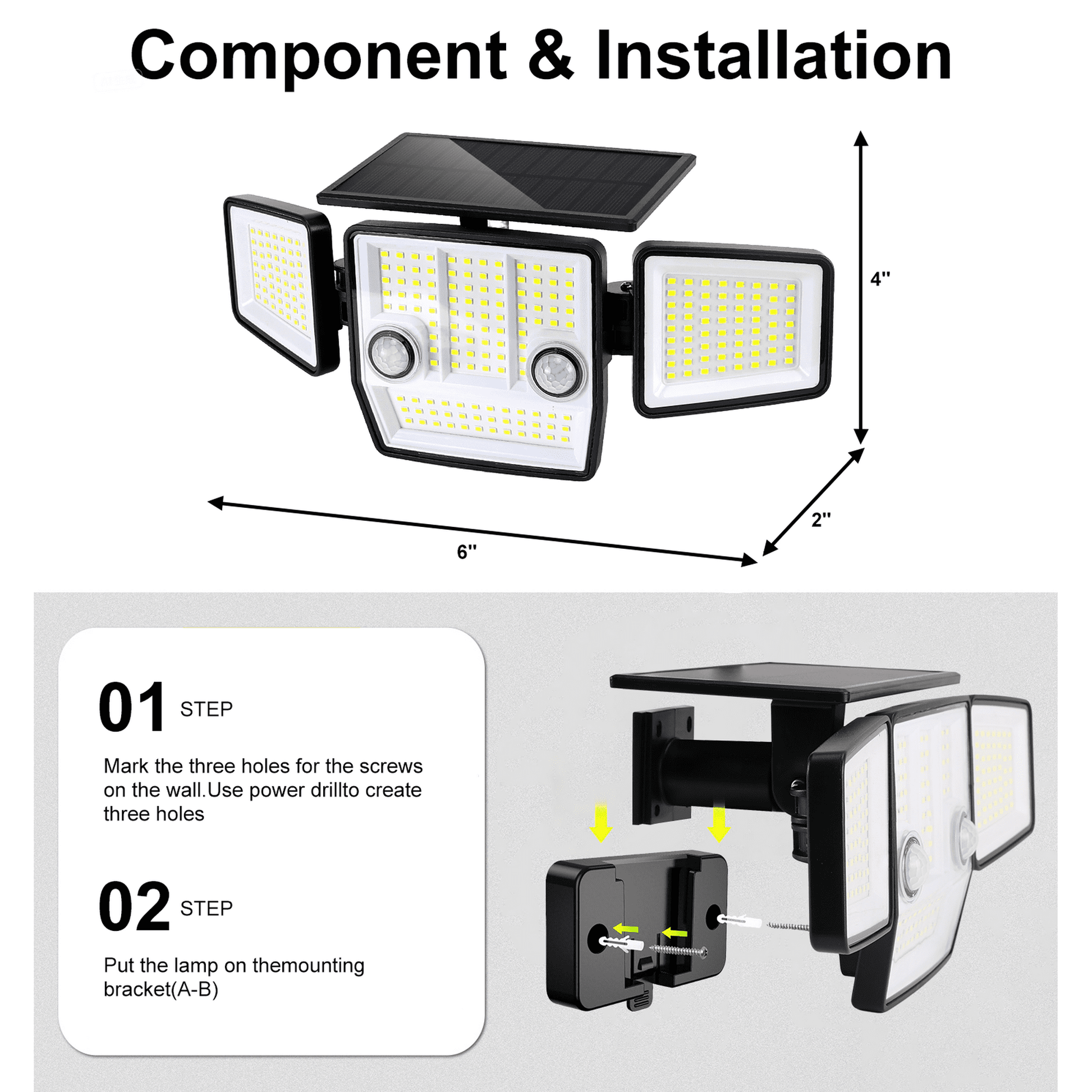 - 【Four-head ultra-bright solar light】248 high-brightness LEDs provide 3000 lumens of floodlighting, and the four lamp heads can adjust the angle independently, flexibly covering large areas such as courtyards, driveways and walls.
