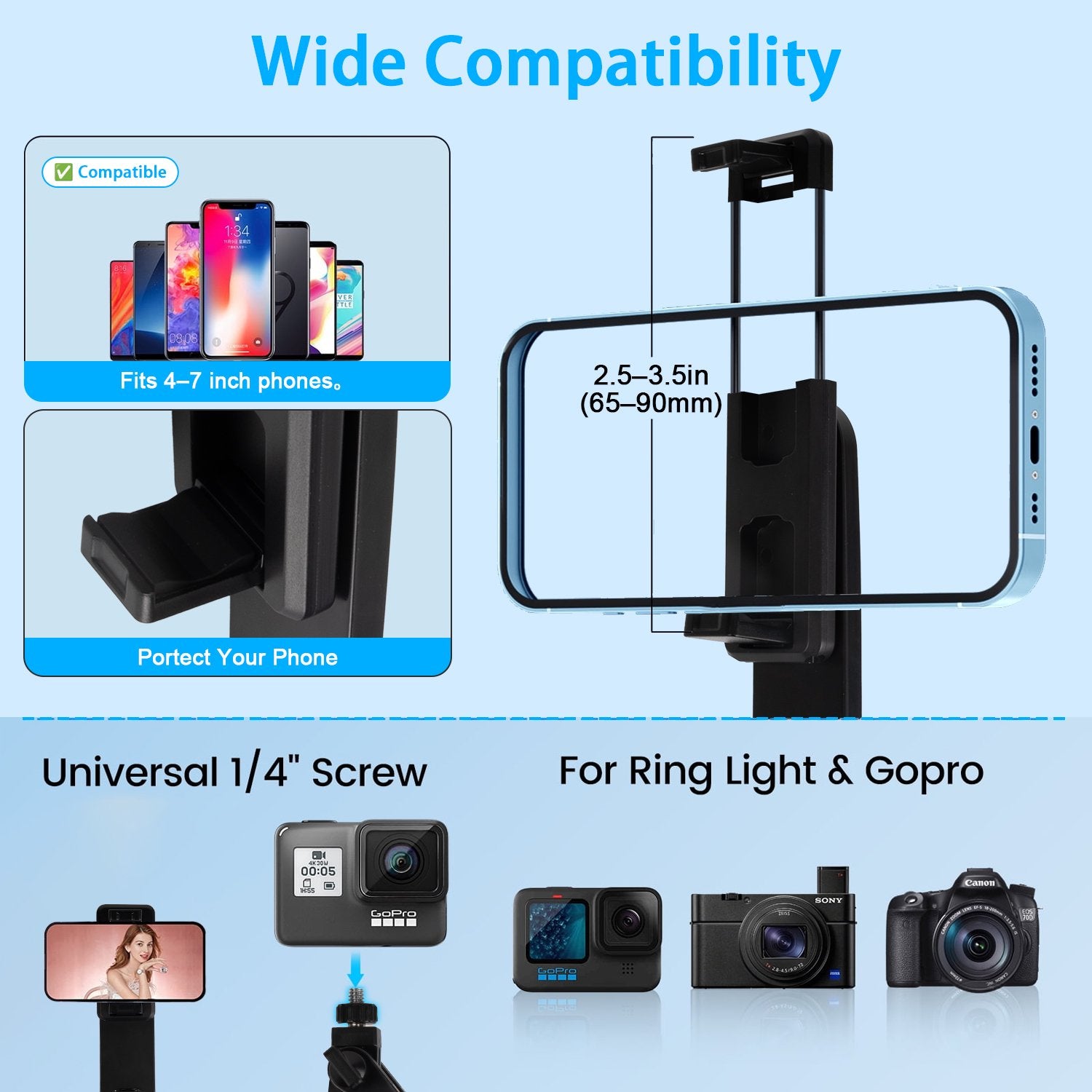 📏 Extendable Height & Wide Compatibility – Adjust from a compact 11.6in folded to an impressive 71in ully extended. Supports phones from 2.5–7in wide , compatible with most iPhone & Android smartphones. Perfect for single-person vlogs or full-body live streaming.