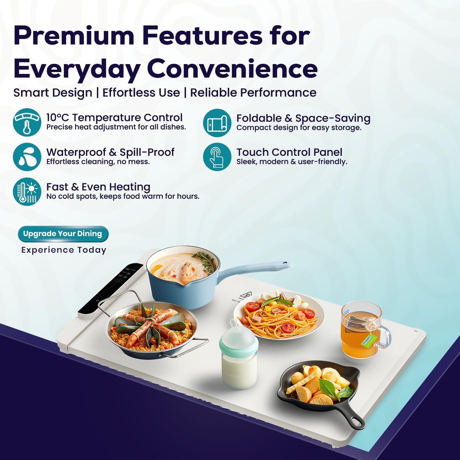 The spacious heating surface accommodates multiple dishes, perfect for family meals, buffets, and parties. Its sleek 10mm ultra-thin design provides a modern look while delivering powerful heating performance.