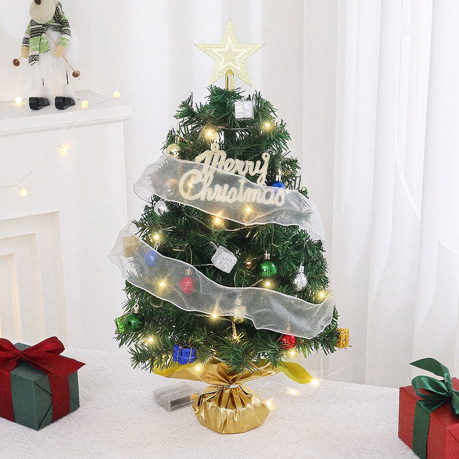Mini Tabletop Christmas Tree Kit with LED Lights, Ornaments, Gift Boxes & Star Topper – Battery Operated Holiday Decor for Home & Office