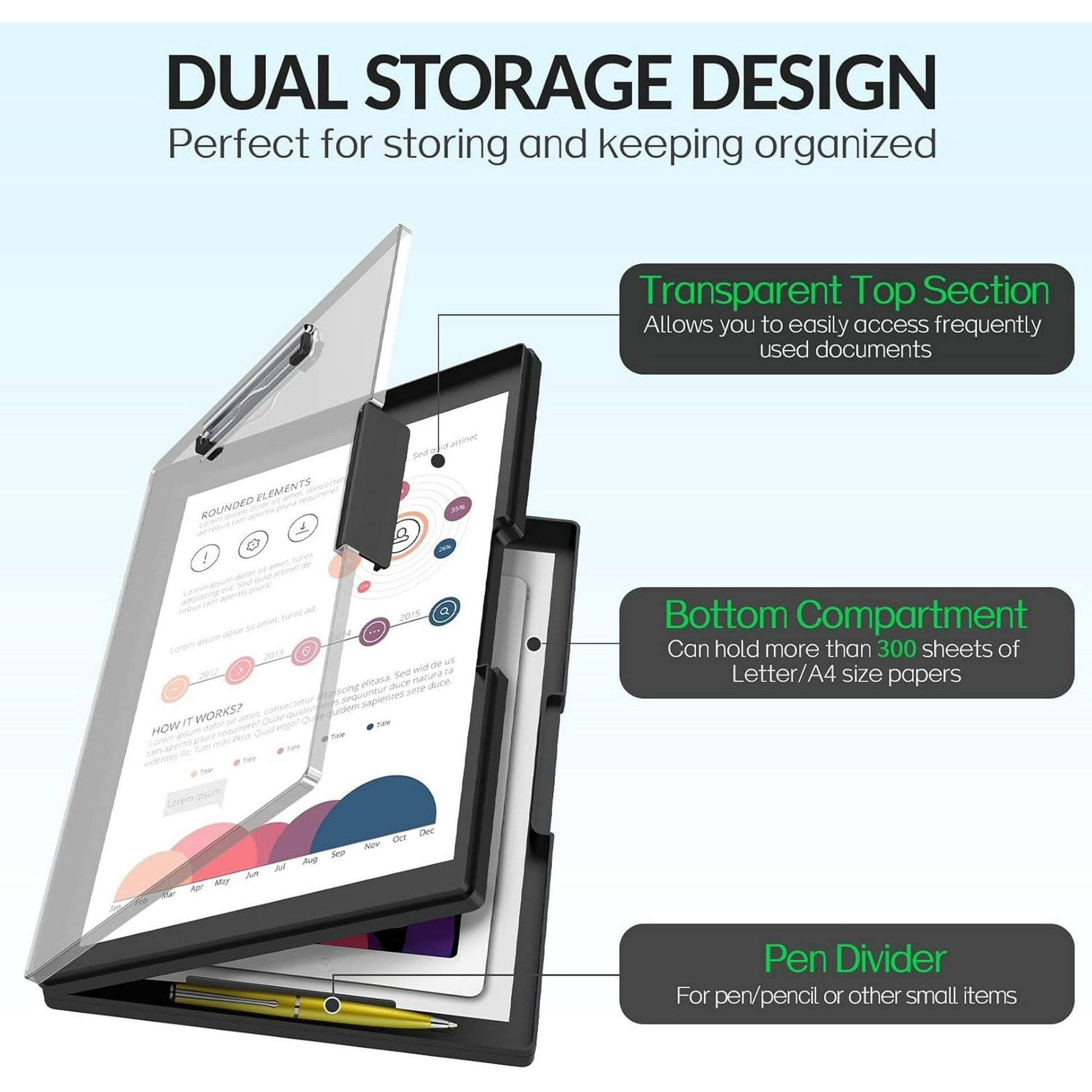 - High Capacity: Storage clipboard built-in a paper storage box, large enough to hold up 300 sheets of A4 paper ,Dual-Layer design ensure roomy space for various needs of storage. Allows to store most daily office supplies and keep them organized