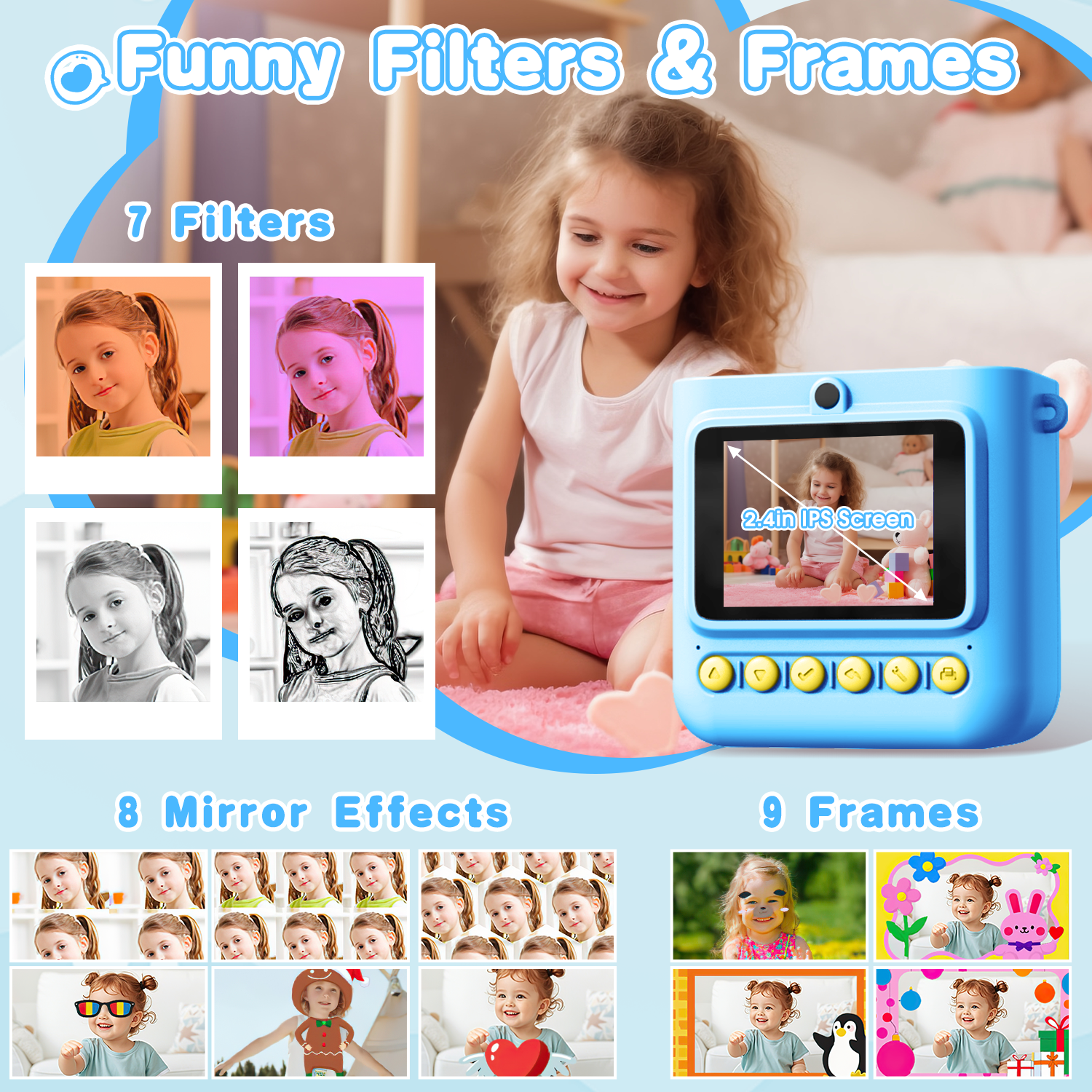 - This kids camera with color instant print, dual-lens design (1080P rear camera + selfie camera), 2.4" color screen, 16x zoom, 20+ filters, 2 print modes, video recording, games, music, and video playback, it is a children's camera that can accompany children.
